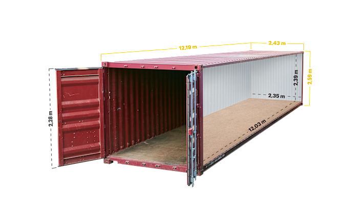 Nuestro contenedor estándar de 40 pies es uno de los más populares del mercado. Este modelo ha realizado un solo viaje, lo que lo convierte en una excelente opción casi nueva. Cuenta con un resistente suelo de madera y la aprobación CSC, listo para aventuras intermodales. ¿No planeas moverlo? Nuestro contenedor estándar de 40 pies es igual de eficaz para almacenar tus mercancías que para transportarlas. ¿Cumple con las normas ISO? Por supuesto, este contenedor las cumple. Encuentra este y otros contenedores de 40 pies en venta o alquiler en nuestra tienda en línea.